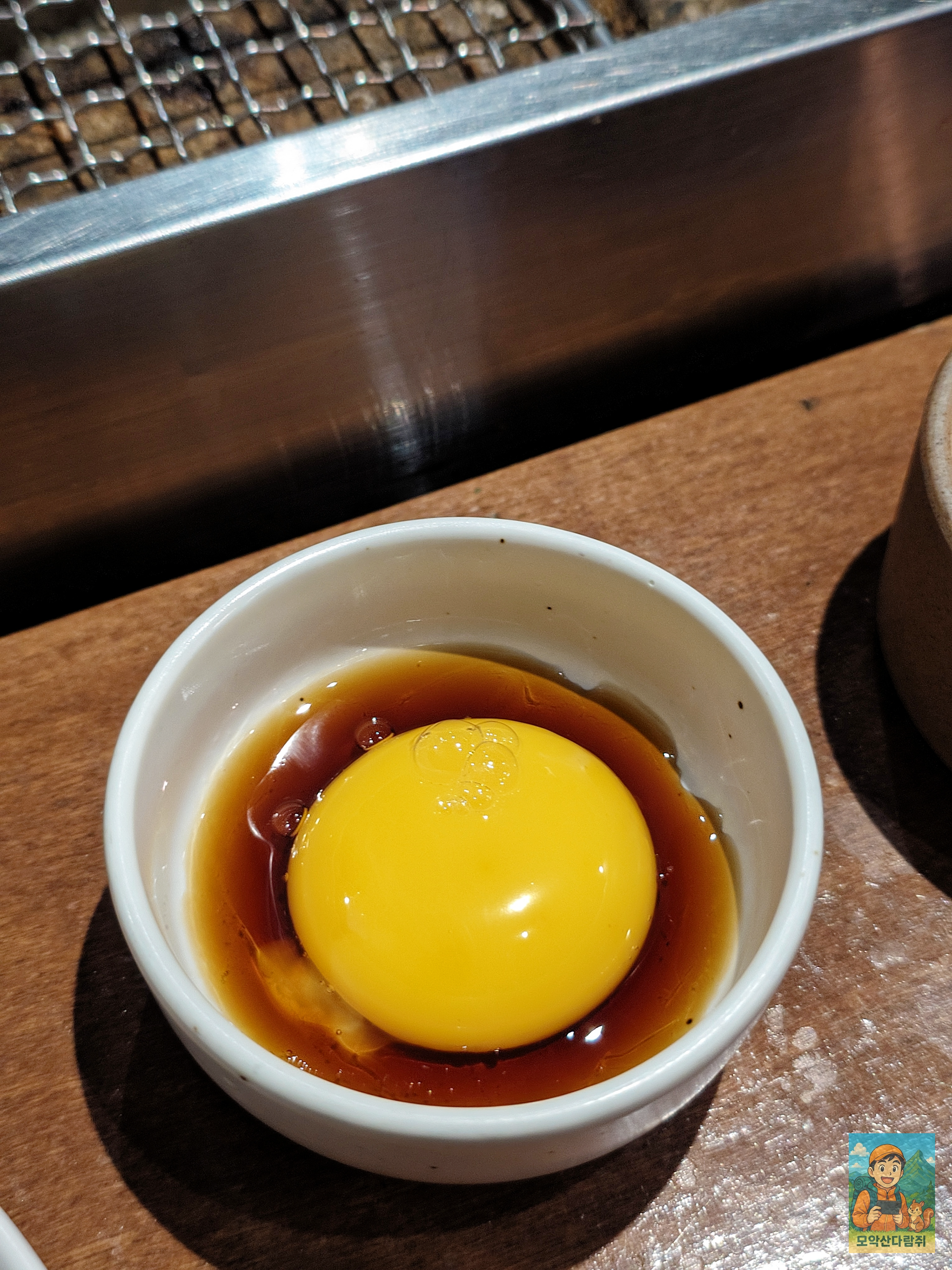 수란이 나오는데~ 간장에 살짝 넣어서 먹으면 엄청 맛있습니다. ㅋㅋ 숯불 함박에 찍어먹으면 굿^^