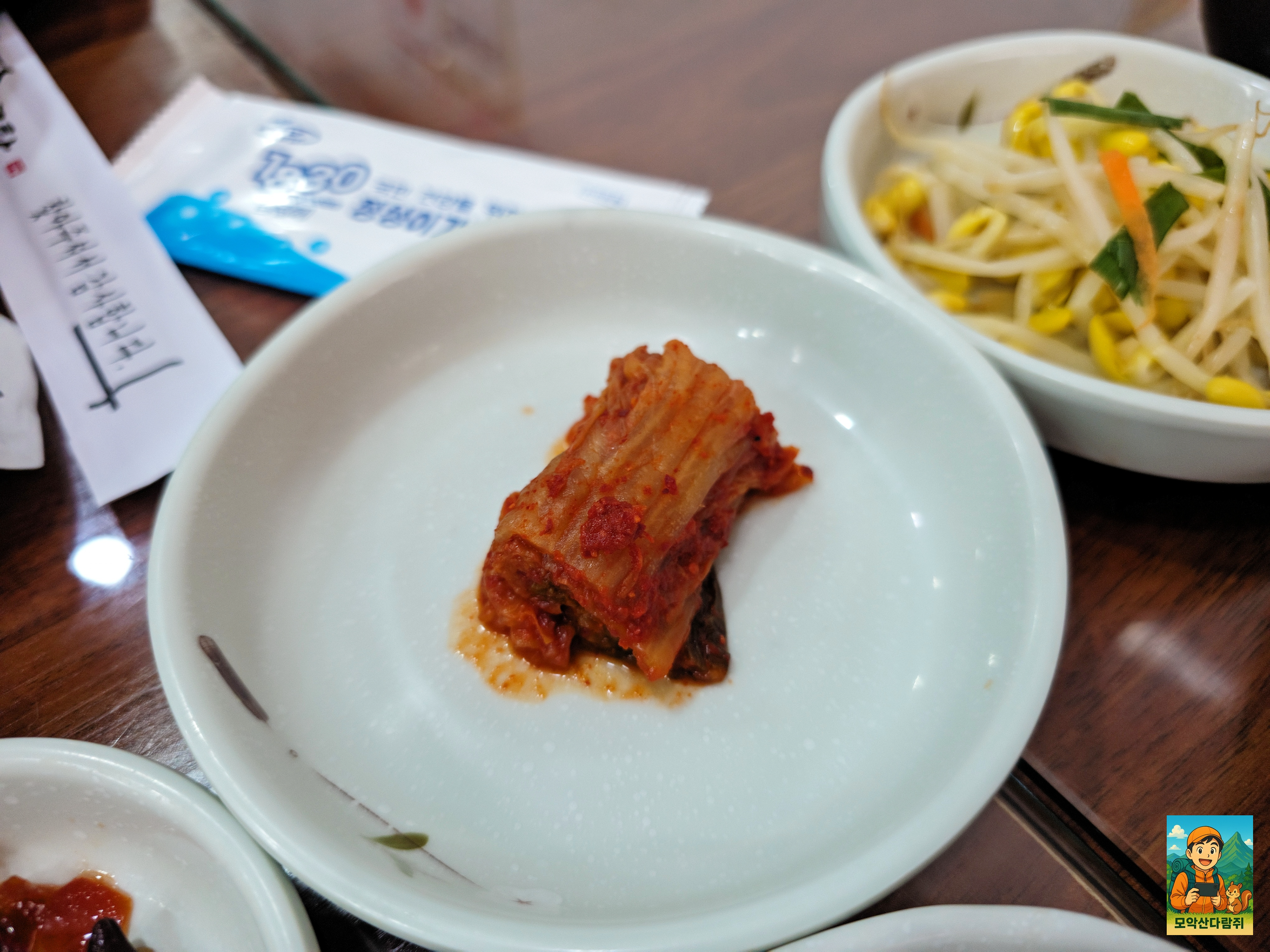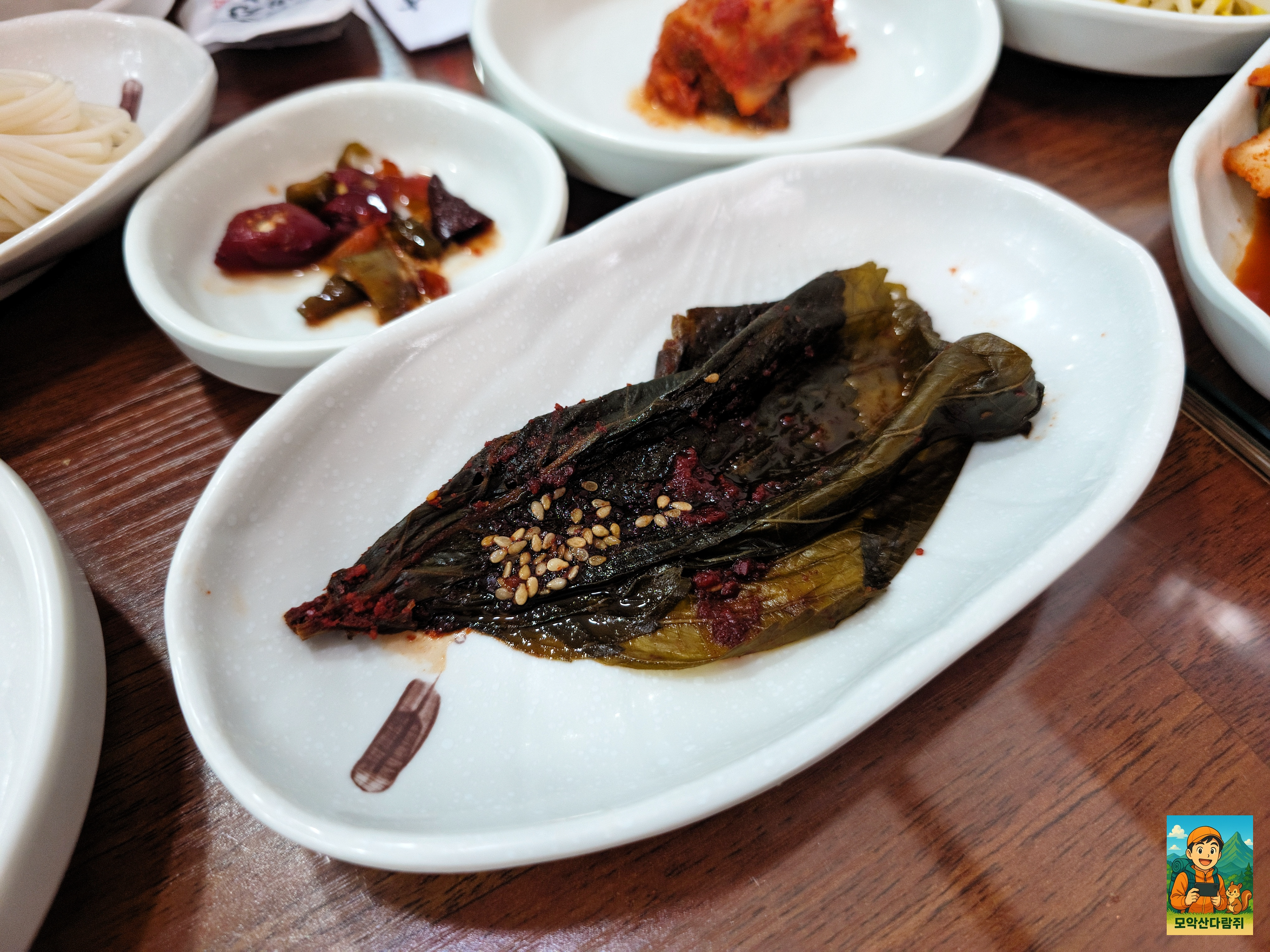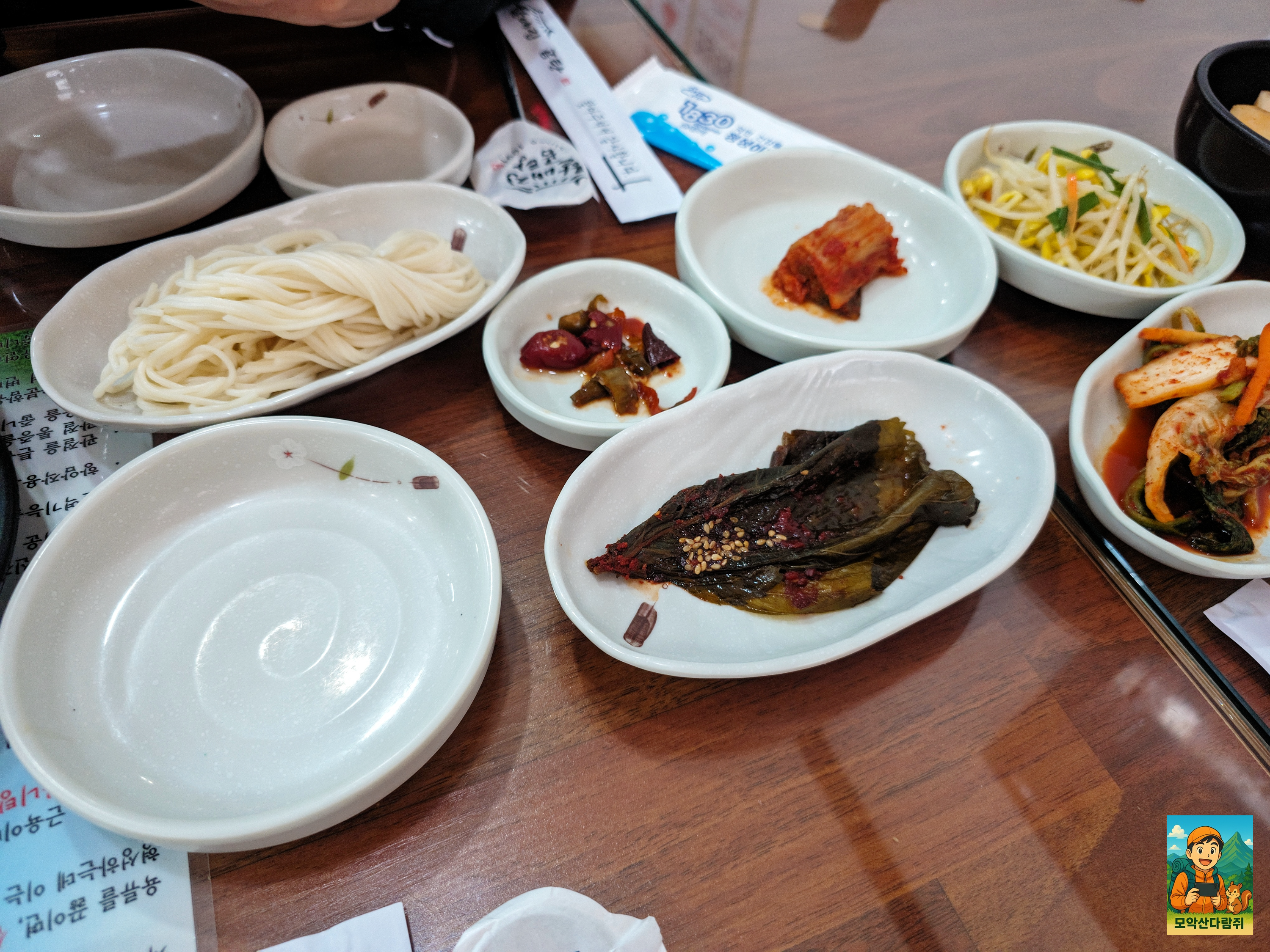 기본 상차림이 차려졌는데요. 국수사리 깻잎 김치 콩나물 겉절이 깍두기가 나옵니다.