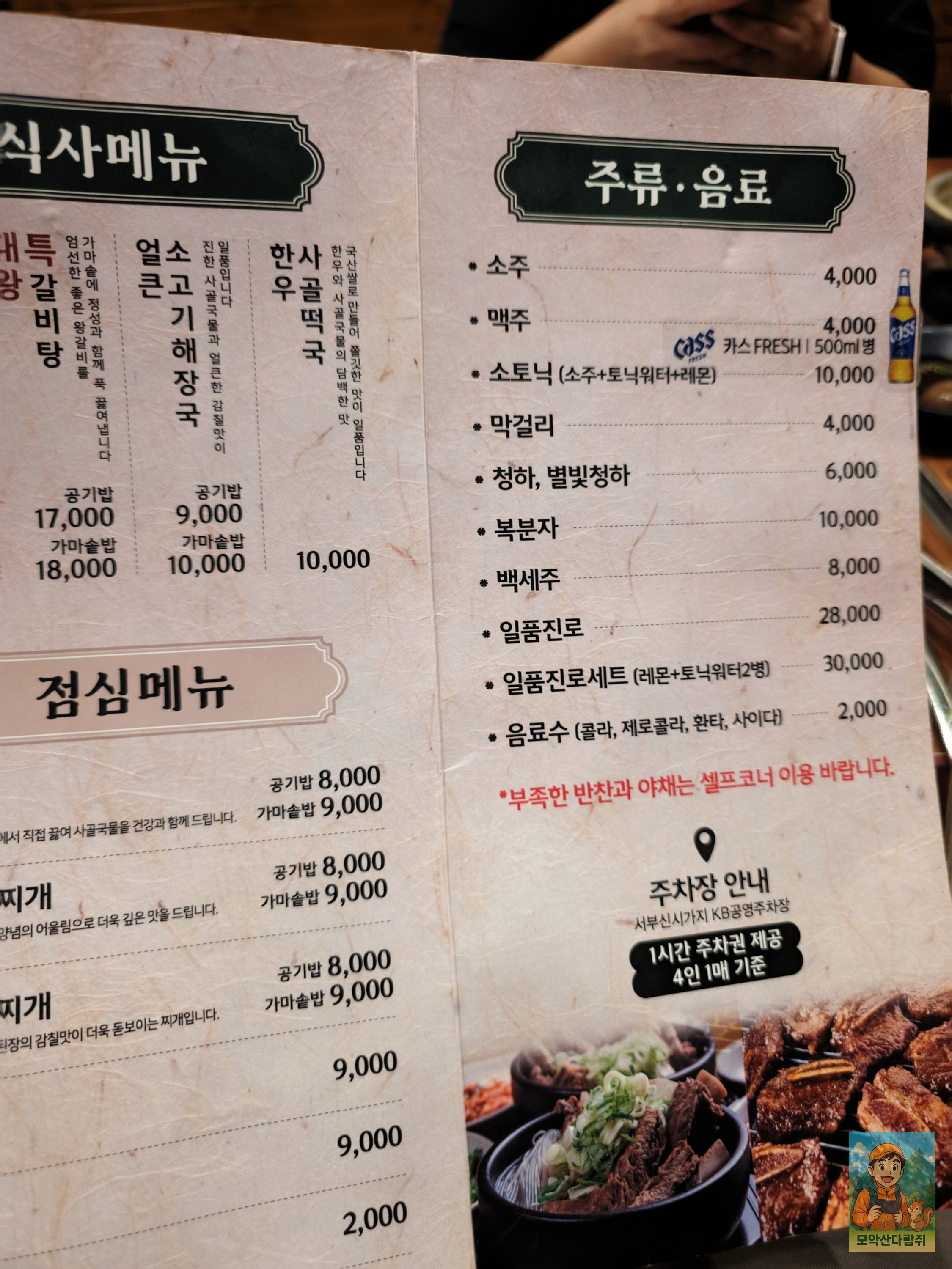 주차 : 매장 앞 주차가능, KB지상공영주차장 1시간 무료제공
